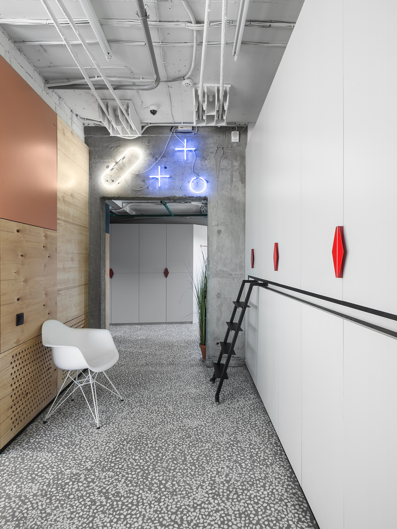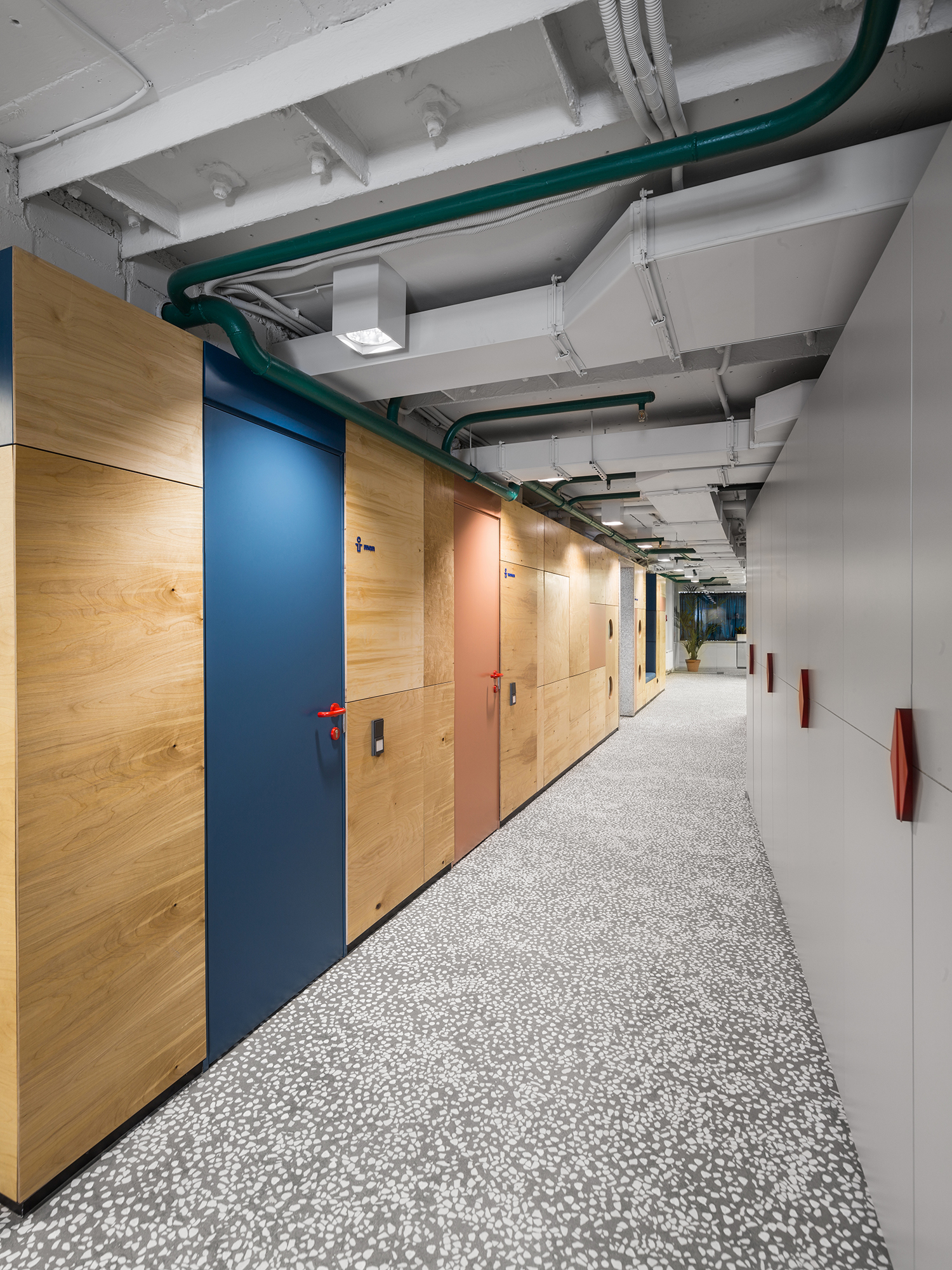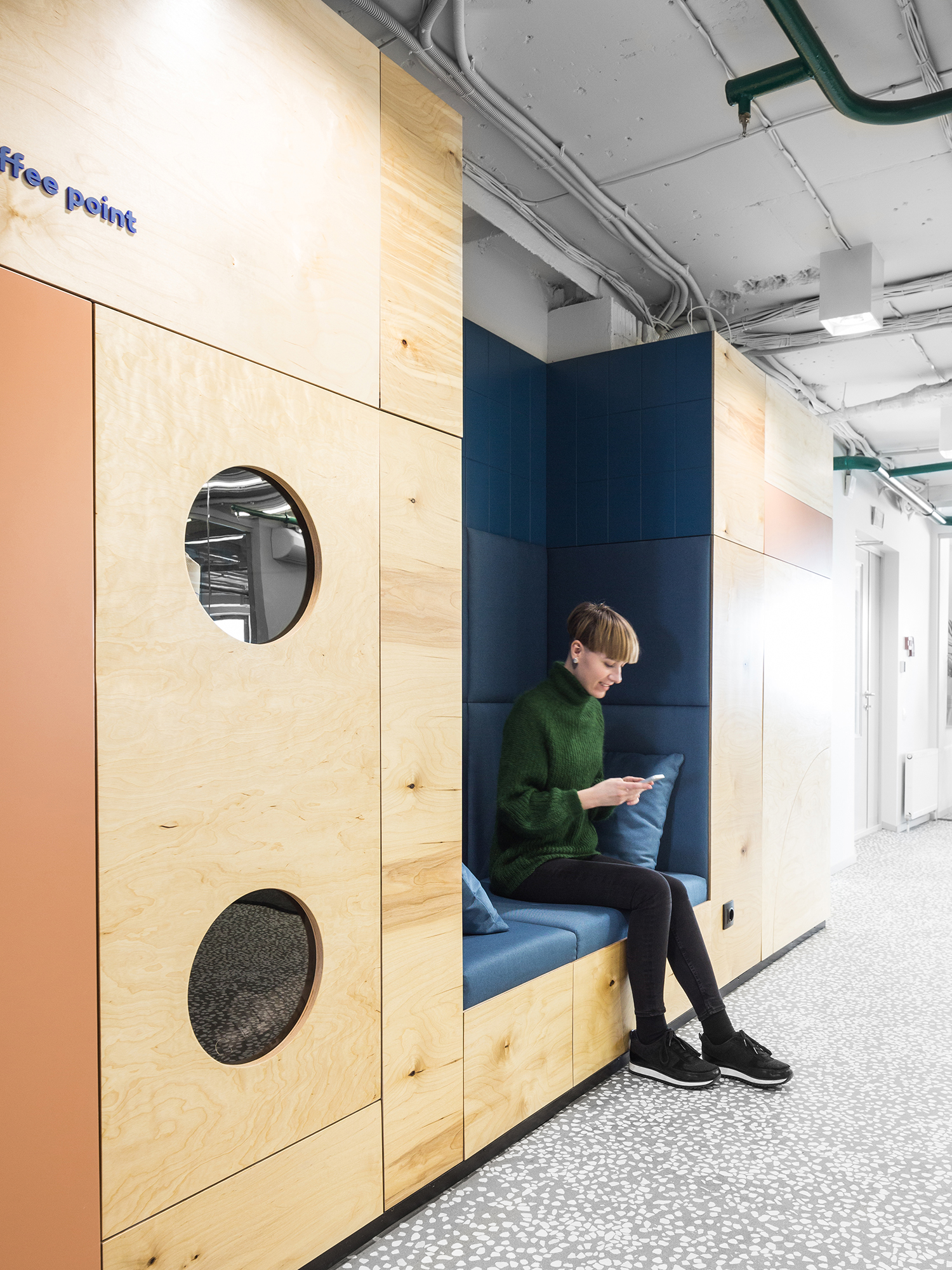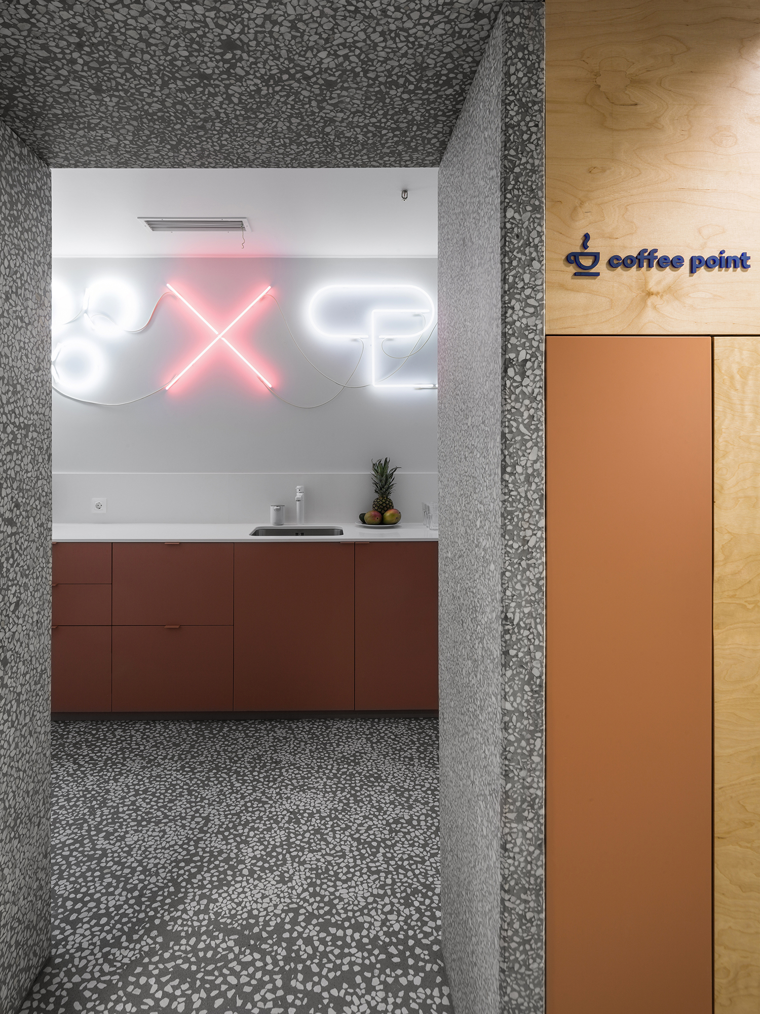 Сочетание в одном пространстве масштабных интерьерообразующих приёмов и более мелких ярких деталей: выдержанные материалы изысканного тераццо пола и теплого объёма из фанеры и яркие цветовые пятна в гармонии с акцентной кастомной графикой.