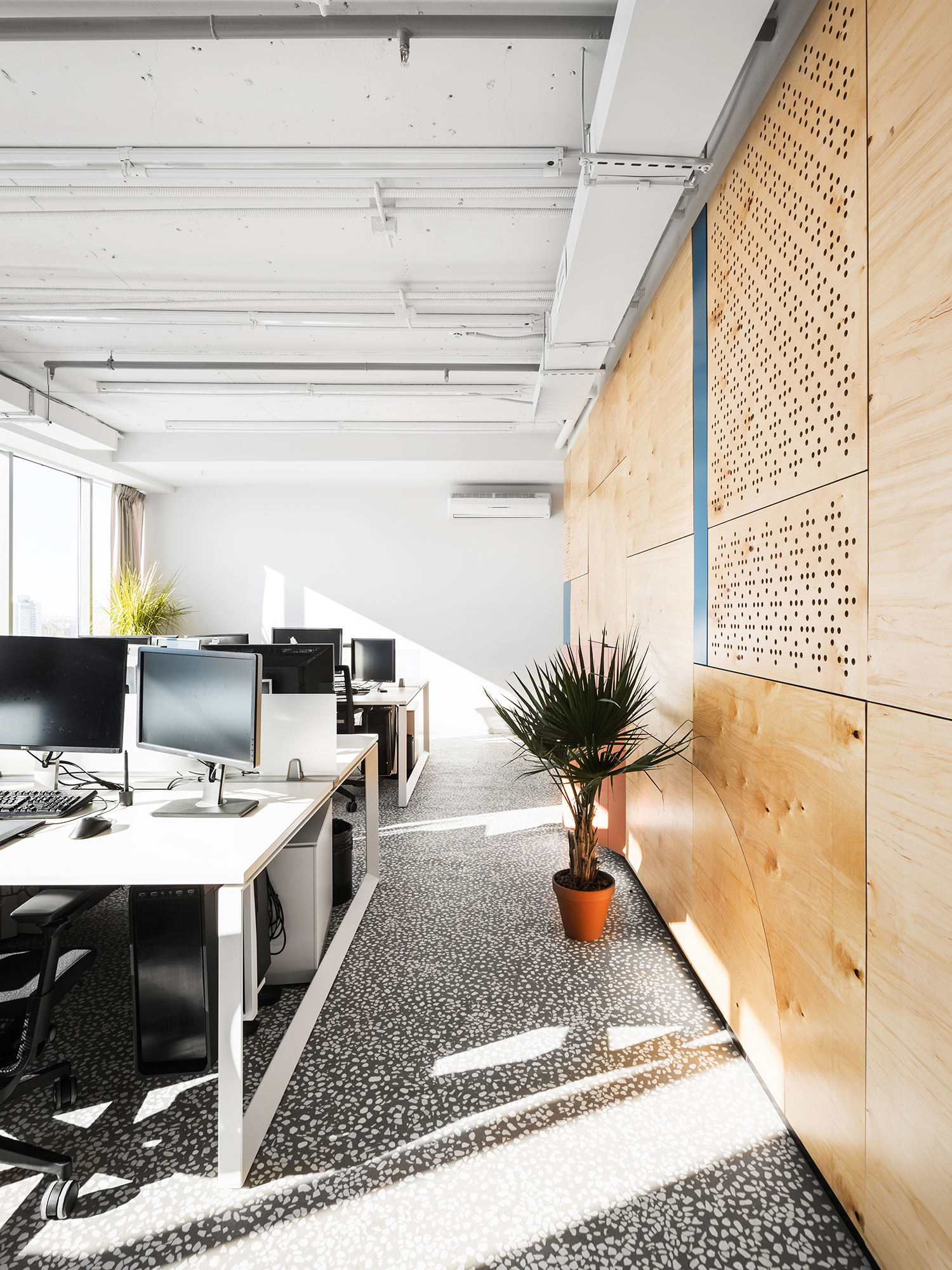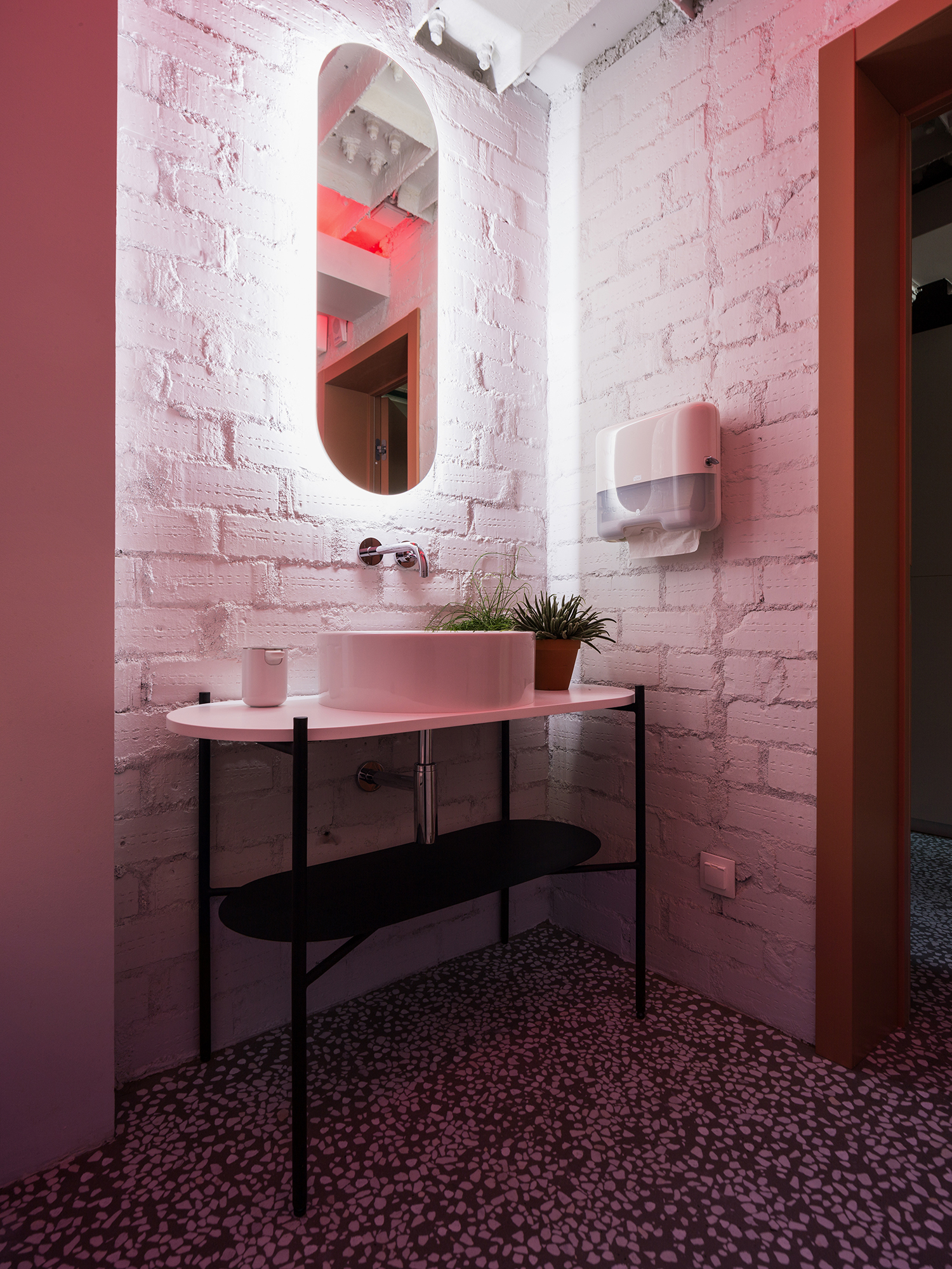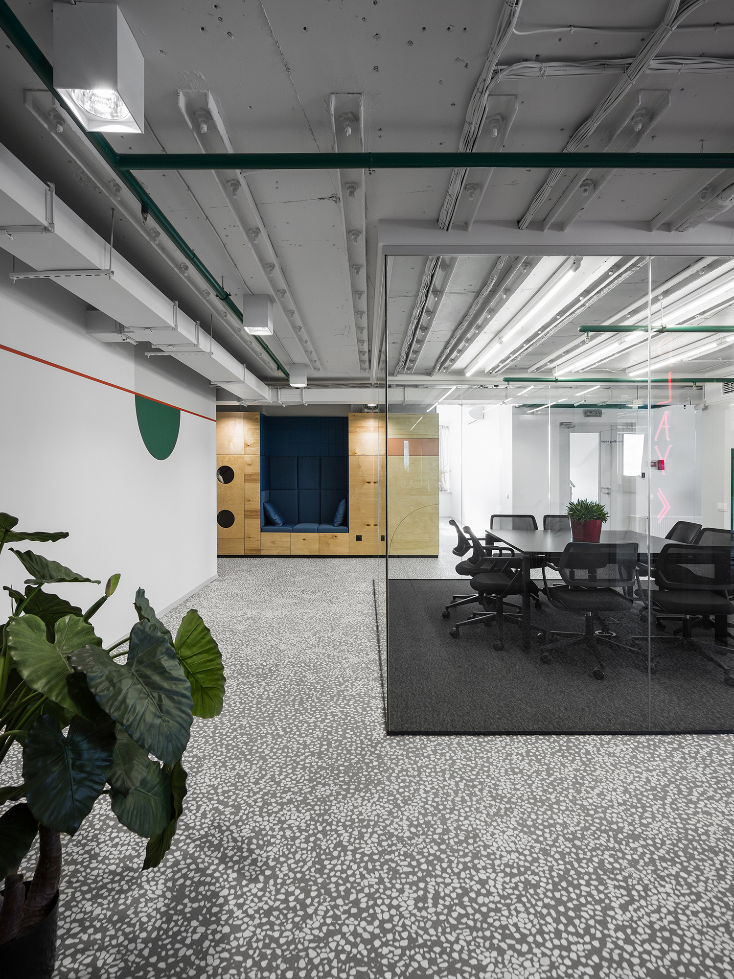 Сочетание в одном пространстве масштабных интерьерообразующих приёмов и более мелких ярких деталей: выдержанные материалы изысканного тераццо пола и теплого объёма из фанеры и яркие цветовые пятна в гармонии с акцентной кастомной графикой.