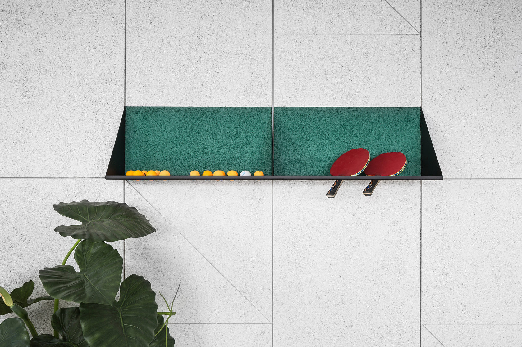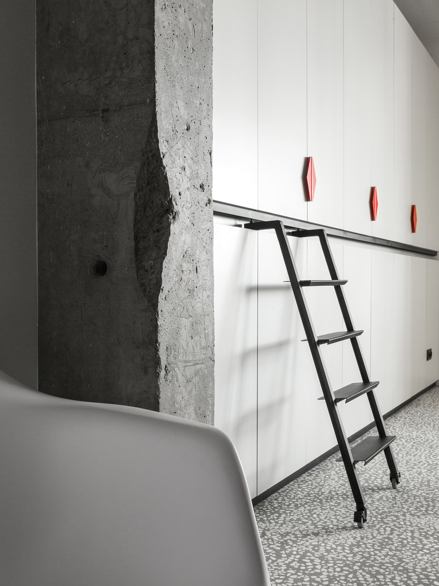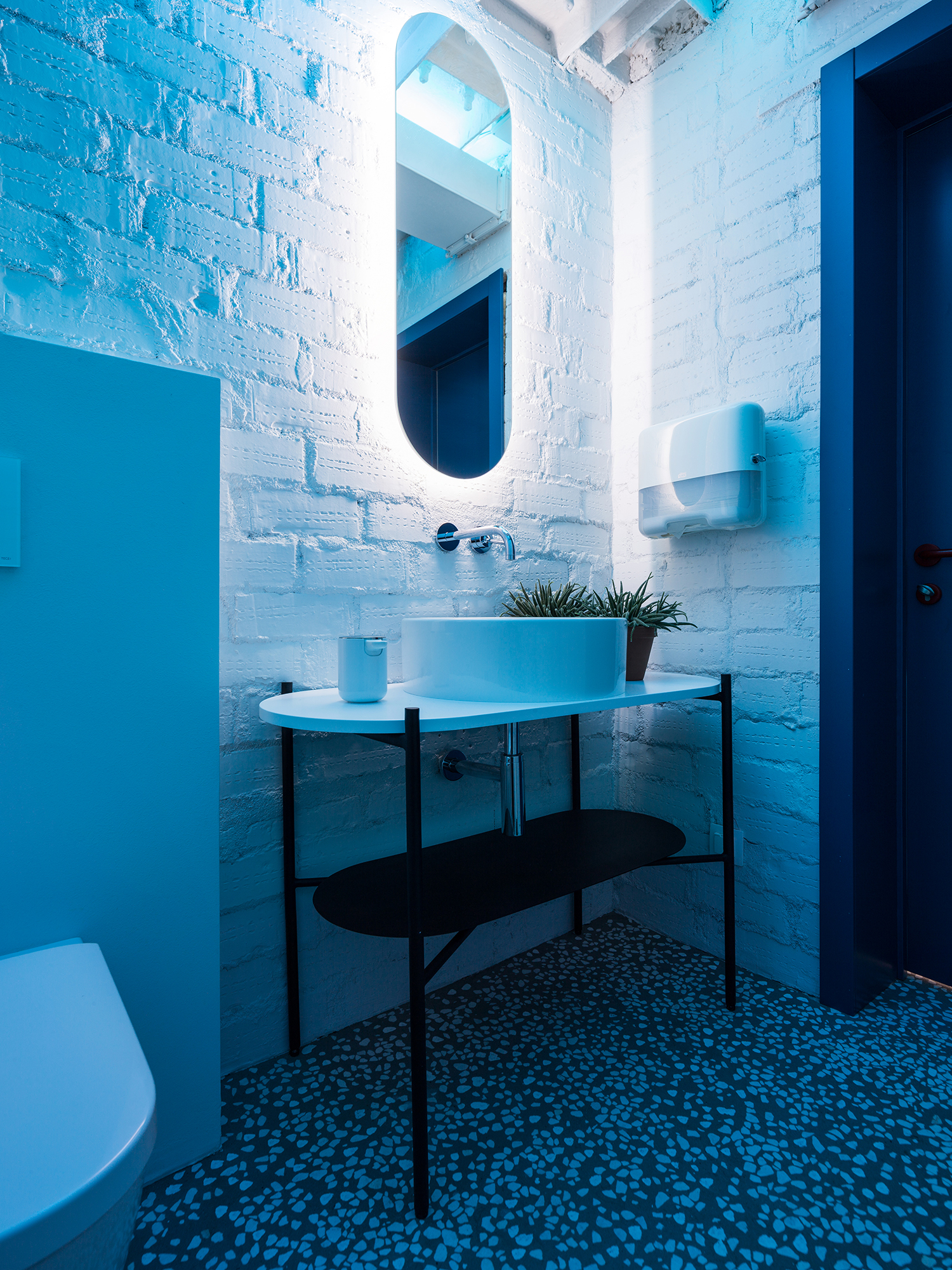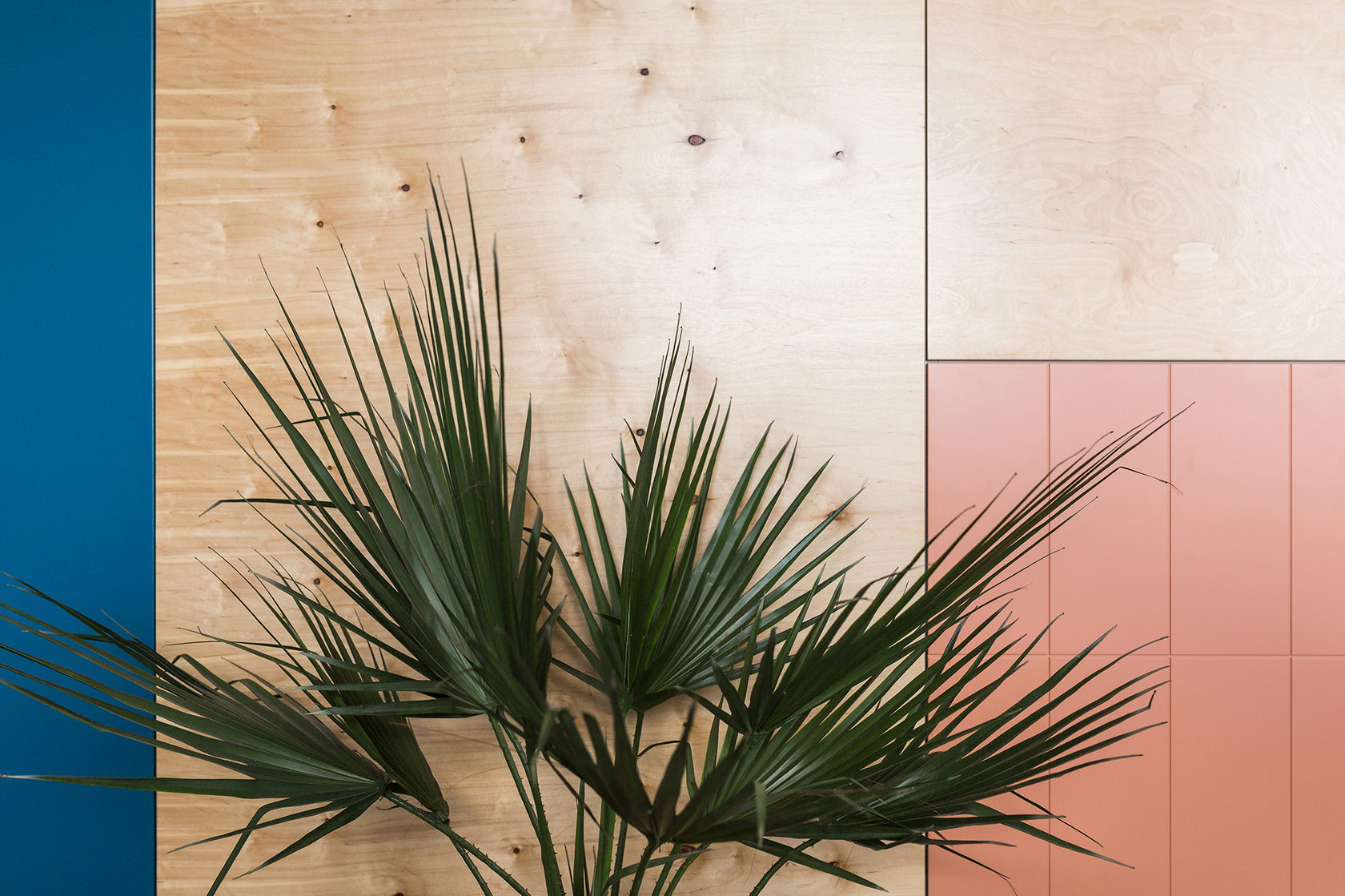 Сочетание в одном пространстве масштабных интерьерообразующих приёмов и более мелких ярких деталей: выдержанные материалы изысканного тераццо пола и теплого объёма из фанеры и яркие цветовые пятна в гармонии с акцентной кастомной графикой.